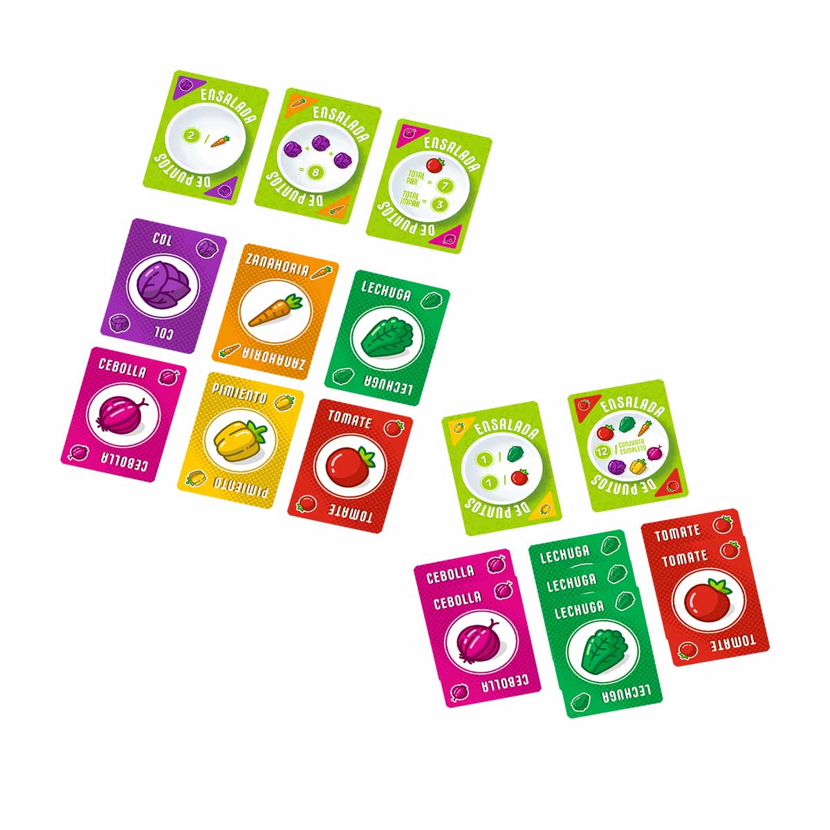 En Ensalada de Puntos los jugadores se encontrarán con un mercado de vegetales compuesto por 6 cartas de hasta 6 variedades de vegetales para ensaladas. Tendremos que adquirir en cada turno una carta, ya sea del mercado o de las 3 opciones de cartas de puntuación disponibles.